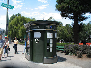 San Francisco’s answer to the public restroom. These pod-shaped toilets dot the city every few blocks; they come with a page-long set of operating instructions and power doors that slide back when you push a button. When you are done, an electronic readout tells you it’s going through a “55-second cleansing cycle,” which I can only assume involves zapping the inside with ozone or something, because one can’t observe it directly.